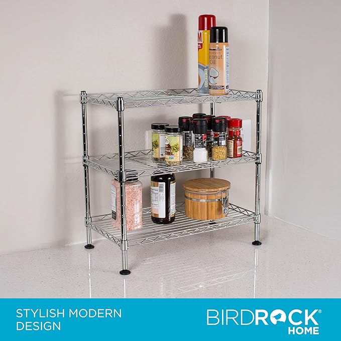 - DURABLE CHROME STEEL: Crafted from high-quality chrome steel, this shelving unit offers durability and stability, supporting up to 100 lbs. The rust-resistant finish ensures long-lasting use, even in humid environments like bathrooms or kitchens.
