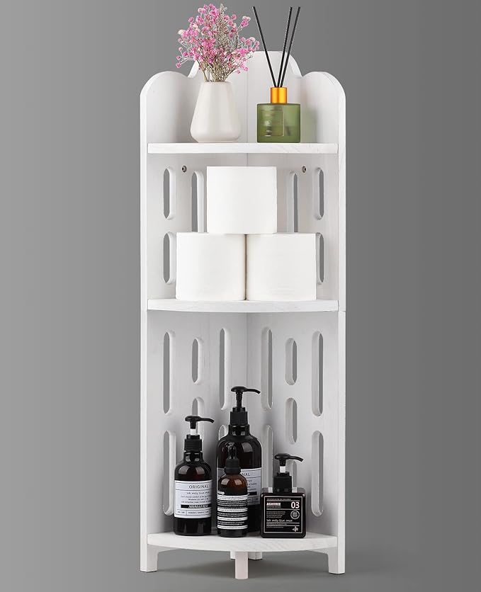 Meangood Bathroom Corner Shelf Stand, 3 Tier Solid Wood Display Shelf for Narrow Space, Shower Corner Shelf, Plant Stand Nightstand, for Living Room, Bedroom, Home Office, Elegant White