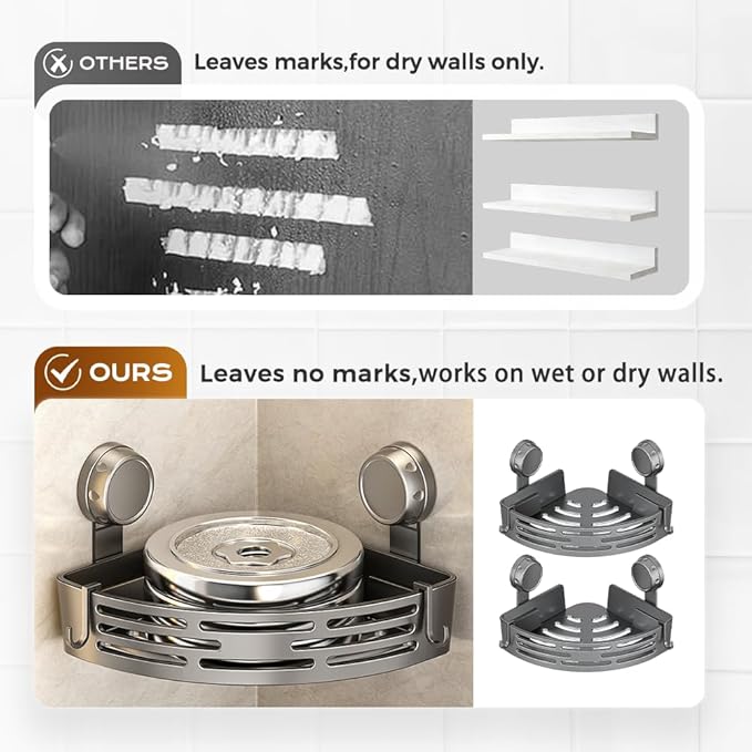 - 【Effortless No-Drill Installation & Secure Mounting】 Choose between sturdy suction cup mounting or permanent drilling to suit your space. The strong suction cups provide a reliable, tool-free hold on smooth surfaces like ceramic tile, glass, or marble—ideal for a no-drill shower caddy that fits perfectly in 90-degree corners.